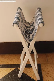 Banquito de madera antiguo, pintado de blanco y con un aporte modelo de género Toile de jouy en azul. Para darle la firmeza forramos una loneta blanca con la tela y tachas para una linda vista. Seguimos combinando con un buen resultado.